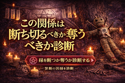 この関係は、まだ大きく固定化していません。 今すぐ強い介入をする段階ではない可能性があります。 改善可能性:55〜65% この段階では「方向性の整理」が最優先です。 感情安定調整 因縁弱化術 軽度縁整理式 今は無理に奪う・断つよりも まずは無料相談で 感情が徐々に固まり始めています。 改善可能性:65〜75% 今ならまだ流れは変えられます。 三者関係調整式 心変転導術 流動化促進法 断つのか、奪うのか。 まずは方向性を決めるための 関係は大きく揺れています。 このタイミングは 改善可能性:75〜85% 正しい設計であれば、結果は出やすい段階です。 縁転換術 断縁切替式 執着反転法 ここで迷うと流れが戻ります。 今は「待つ」よりも 無料相談で具体的可否を確認してください。 感情が強く絡み合っています。 このまま放置すると 改善可能性:70〜80% ただし、単独施術では不十分な可能性があります。 因縁分解術 感情遮断式 三者構造再編術 この段階は まずは可否判断を急いでください。 関係はすでに強く固定化しかけています。 相手の態度が固い ここから自然改善は困難です。 改善可能性:60〜75% 難易度は高めですが、 因縁逆転式 固着解除法 強制縁流動術 この段階は 今すぐ無料相談で